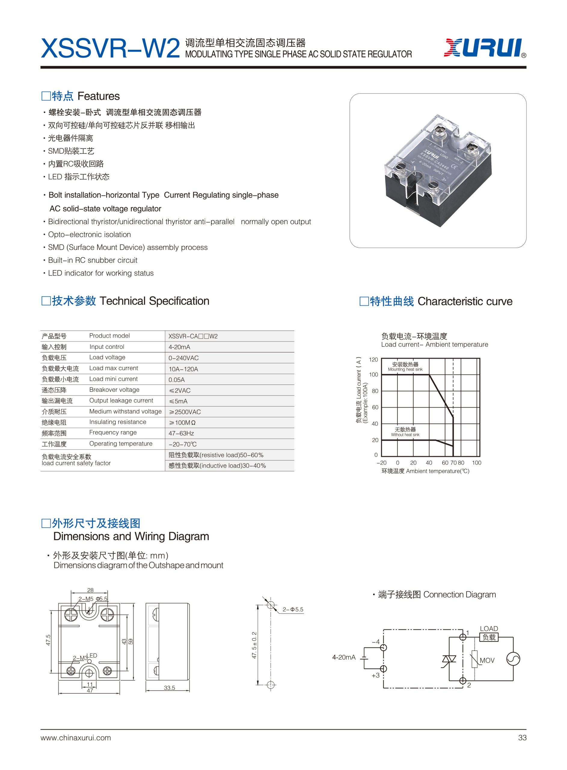 XSSVR-CA W2系列是一款水平型单相交流固态电压调节器,接受4–20mA模拟输入信号进行相位角电压调节。其结构紧凑,并采用螺丝安装方式,特别适用于工业自动化系统中的模拟闭环控制。适用于阻性和部分感性负载。
